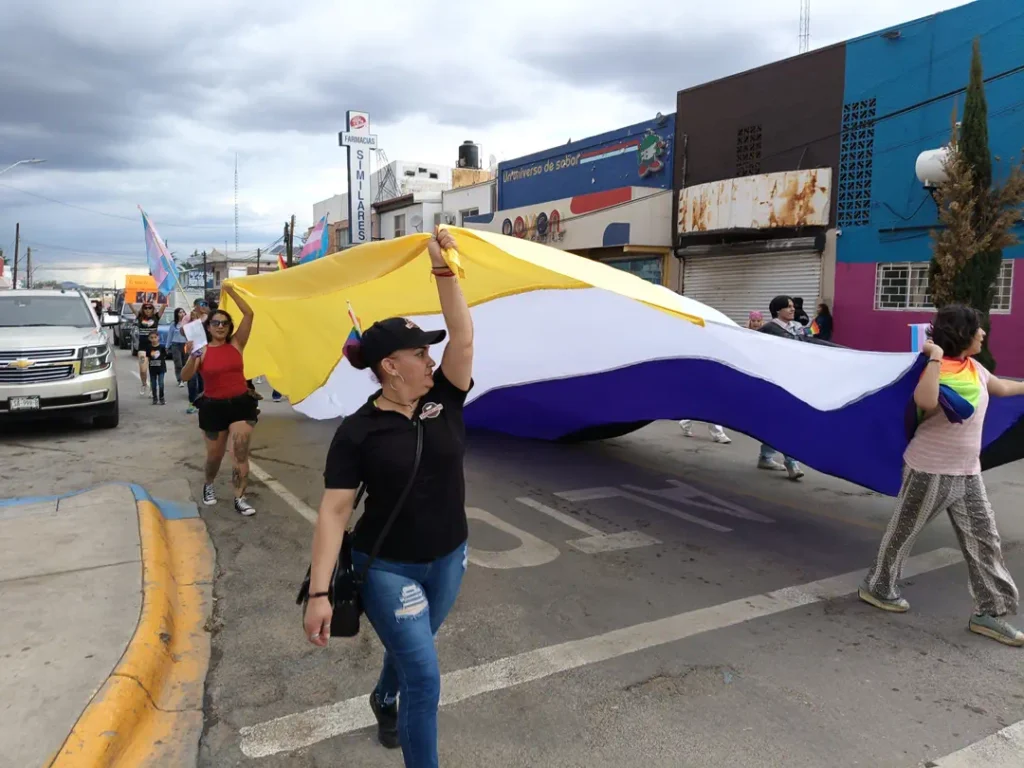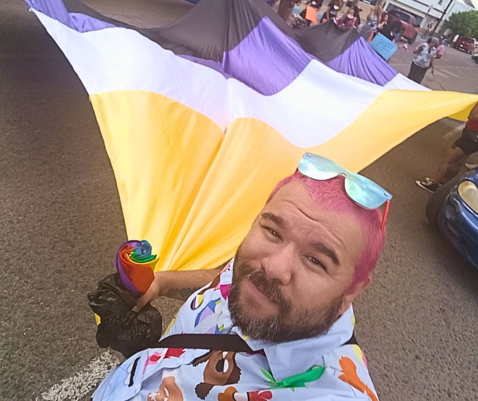 Este año, para celebrar esta incertidumbre que es el género, quise hacer algo especial para que otras personas NB se sintieran un poquito más representadas en la marcha del orgullo, y que el resto de la gente viera que también aquí estamos. Para no hacer muy larga la historia, me lancé a la tienda y compré 10 metros de tela de cada color de la bandera No Binaria: amarillo, blanco, morado y negro. Para hacerla una bandera fue clave la invaluable ayuda (y paciencia) de Iracebeth, una de las personas que organiza la Marcha del Orgullo de Cuauhtémoc, Chihuahua, que contactó a la costurera que dijo: sí, yo lo hago.