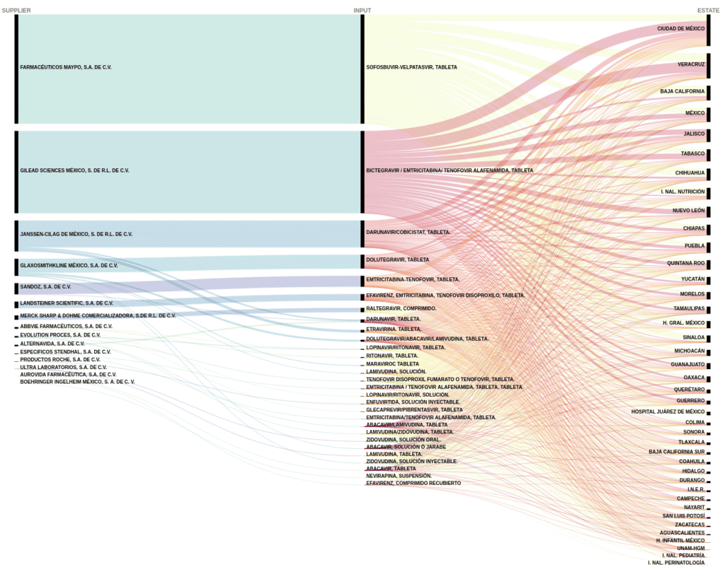 En total, México erogó 1,685,779,235.06 pesos en 1,529 contratos de Tratamiento Antirretroviral o (TARV) en 2020, último año en el que el país reportó pública y desagregadamente las compras de medicamentos consolidados. Dicha información obtenida del portal de transparencia de la Secretaría de Salud (SSa) nos permite además entender la ruta del dinero hasta ese mismo año1 en que dejaron de transparentar las compras públicas consolidadas debido al cambio de modelo de compra por licitación a compra consolidada.